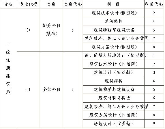 ㈠ 一級注冊建筑師執業資格專業、類別、科目及代碼如下: