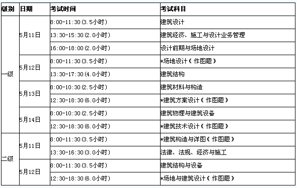 (一)一級注冊建筑師考試于2013年5月11日至14日進行,二級注冊建筑師考試于2013年5月11日至12日進行,具體時間安排如下: