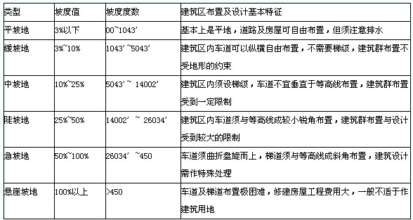 地形指地表面起伏的狀態(地貌)和位于地表面的所有固定性物體(地物)的總體,主要是采用等高線來表示地形。地形圖上相鄰兩條等高線之間的水平距離稱為等高線間距,其疏密反映了地面坡度的緩與陡。根據坡度的大小,可將地形劃分為六種類型,地形坡度的分級標準及與建筑的關系見表1--1。