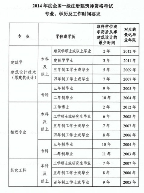 摘要 2014年度全國一、二級注冊建筑師資格考試專業、學歷及工作時間要求。