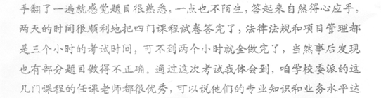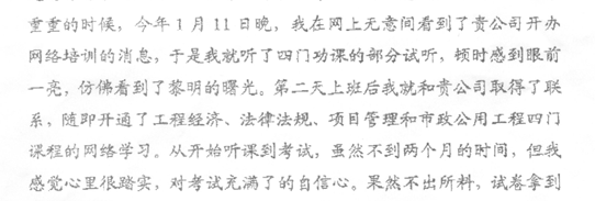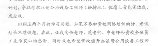 網友的發言中也不乏對網校本次輔導的老師及網校表示感謝的,認為網校老師講課透徹,重難點把握得當。網校今天受到了來自山東學員傳真來的感謝信,他說:“書卷拿到手翻了一遍就感覺題目很熟悉,一點兒也不陌生,答起來自然得心應手,兩天的時間很順利地把四門課程試卷答完了……”