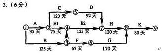 方案三,租賃設備安裝調試l0天,不超過E的總時差(或不影響工期),但增加費143 750元(350元/天×125天=43750元)。(2分)