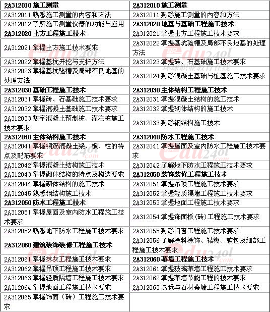 本章分為兩節。第一節建筑工程技術要求,包括了建筑結構技術、建筑構造要求和建筑材料。第二節是建筑施工技術,包括施工測量、地基與基礎工程施工技術、主體結構工程施工技術、防水施工技術、裝飾裝修工程施工技術與幕墻工程施工技術等部分。在幕墻工程施工技術中增加了幕墻節能工程技術要求的有關內容。第一章的內容與2008年版相比,主要是調整,如把原第二節的混凝土結構、砌體結構的受力特點等調整至第一節,民用建筑構造中刪去了關于防潮層、散水、滴水等構造措施,補充了關于幼兒園、學校、一般民用建筑中欄桿的高度等與使用安全相關的構造要求。