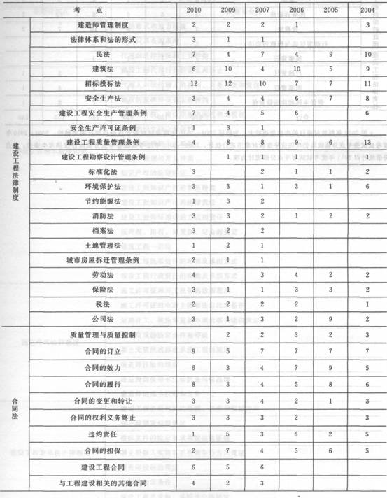 度考試試卷考點分值統計仍按相應年度教材章節進行統計。2004―2010年度考試試卷考點分值統計僅供考生參考,考點