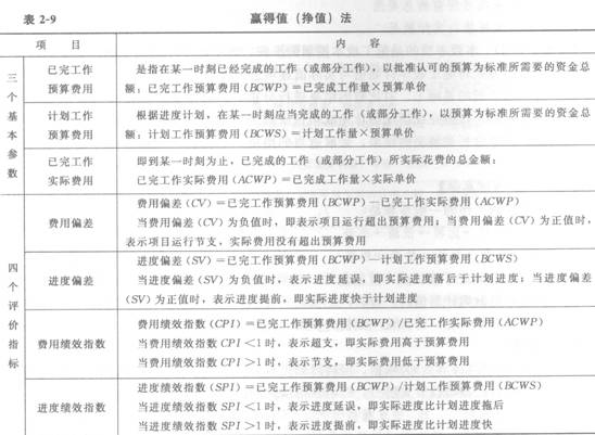 已完工作預算費用;計劃工作預算費用;已完工作實際費用;費用偏差;進度偏差;費用績效指數;進度績效指數;橫道圖法;表格法;曲線法;偏差原因分析。