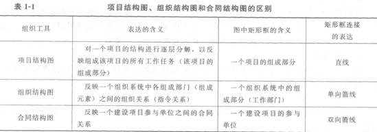 4.項目結(jié)構(gòu)圖、組織結(jié)構(gòu)圖和合同結(jié)構(gòu)圖的區(qū)別項目結(jié)構(gòu)圖、組織結(jié)構(gòu)圖和合同結(jié)構(gòu)圖的區(qū)別見表1―1。