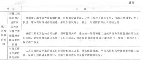 材料設(shè)備的質(zhì)量控制;工藝方案的質(zhì)量控制;合理選擇和正確使用施工機械設(shè)備是保證施工質(zhì)量的重要措施;基坑降水、排水、加固維護(hù);建立統(tǒng)一的現(xiàn)場施工組織系統(tǒng)和質(zhì)量管理的綜合運行機制;施工作業(yè)環(huán)境因素的控制。