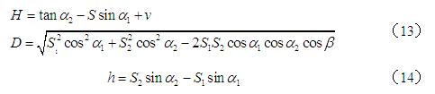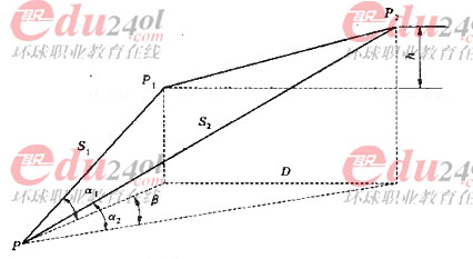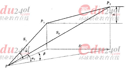 在與P1、P2通視的任一點P上安置全站儀,首先觀測P至P1、P2的斜距S1、S2,豎直角α1、α2,以及PP1至PP2間的水平夾角β,然后可由余弦公式計算P1P2的平距D和高差h:
