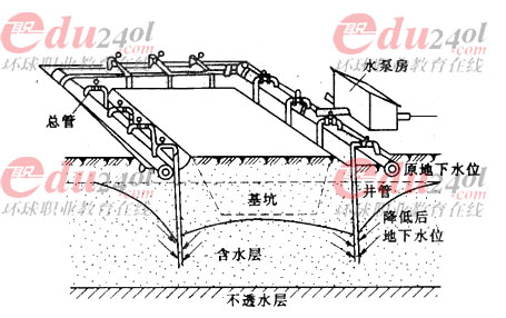 兩者的主要區別在于:①管井是單獨作用的排水設備,輕型井點則是一個排水系統;②管井排水中地下水在重力作用下進入管井,輕型井點排水中地下水由其他設備的抽吸作用流入井管。
