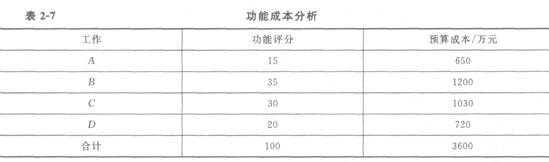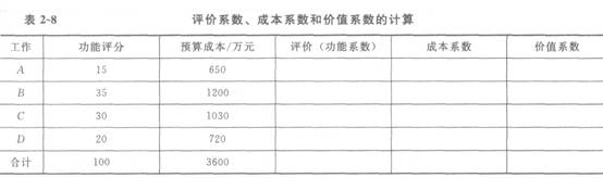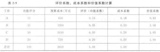 某施工單位承接了某項工程的總承包施工任務(wù),該工程由A、B、C、D四項工作組成,由于施工場地狹小,為了進行成本控制,項目經(jīng)理針對各項工作進行了分析,其功能成本分析結(jié)果見表2-7。
