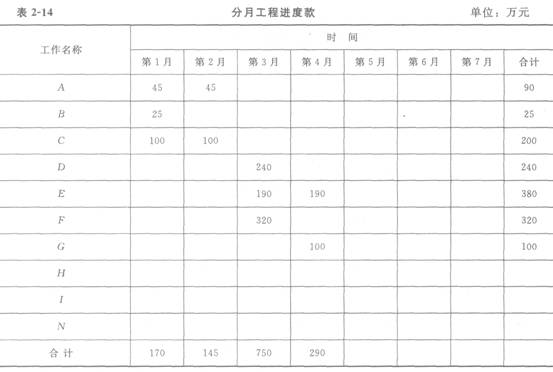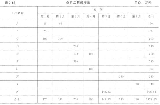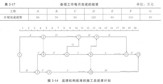 某工程,建設(shè)單位與施工單位按照《建設(shè)工程施工合同(示范文本)》簽訂了施工合同,采用可調(diào)價施工合同形式。工期20個月,項目監(jiān)理機構(gòu)批準的施工總進度計劃如圖2―14所示,各項工作在其持續(xù)時間內(nèi)均按勻速進展,每月計劃完成投資見表2―17。