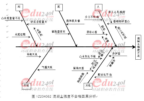 因果分析圖法,也稱為質(zhì)量特性要因分析法,其基本原理是對每一個質(zhì)量特性或問題,采用如圖1Z204062所示的方法,逐層深入排查可能原因,然后確定其中最主要原因,進行有的放矢的處置和管理。