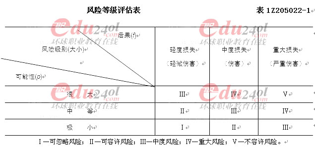 根據(jù)對危險源的識別,評估危險源造成的風(fēng)險可能性和大小,對風(fēng)險進行分級。GB/T28002推薦的簡單的風(fēng)險等級評估如表1Z205022-1所示,結(jié)果分為Ⅰ、Ⅱ、Ⅲ、Ⅳ、Ⅴ五個風(fēng)險等級。通過評估,可對不同等級的風(fēng)險采取相應(yīng)的風(fēng)險控制措施。