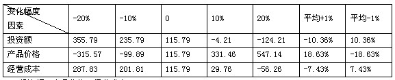 11.某投資方案財務凈現值為115.79萬元,方案經濟效果可行。現對該項目進行單因素敏感性分析,選取投資額、產品價格和經營成本三個不確定因素,令其在初始值的基礎上按±10%、±20%的變化幅度變動,分別計算相應的財務凈現值如下表。該項目對三個因素的敏感程度由高到低依次為( )。