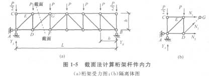 (3)用截面法計算桁架軸力:截面法是求桁架桿件內力的另一種方法,如圖1-5所示。