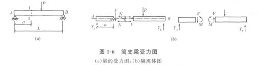 (1) 梁在荷載作用下的內力:圖1-6為一簡支梁。梁受彎后,上部受壓,產生壓縮變形;下部受拉,產生拉伸變形。V為1―1截面的剪力,∑Y=0,V=YA。1 ―1截面上有一拉力N和一壓力N,形成一力偶M,此力偶稱1―1截面的彎矩。根據∑M0=0,可求得M=YA?a。梁的截面上有兩種內力,即彎矩M和剪力 V。