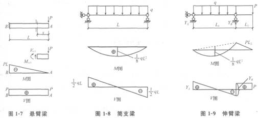 (2)剪力圖和彎矩圖如圖1―7所示,找出懸臂梁上各截面的內力變化規律,可取距A點為χ的任意截面進行分析。首先取隔離體,根據∑Y=0,剪力V(χ)=P;∑M=0,彎矩M(χ)=-P?χ。不同荷載下,不同支座梁的剪力圖和彎矩圖,如圖1―8和圖1-9所示。