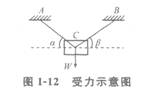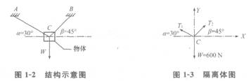 一個物體,重量為W,通過兩條繩索AC和BC吊著,計算AC、BC拉力的步驟為:首先取隔離體,作出隔離體受力圖;然后再列平衡方程,∑X=0、∑Y=0,求未知力T1、