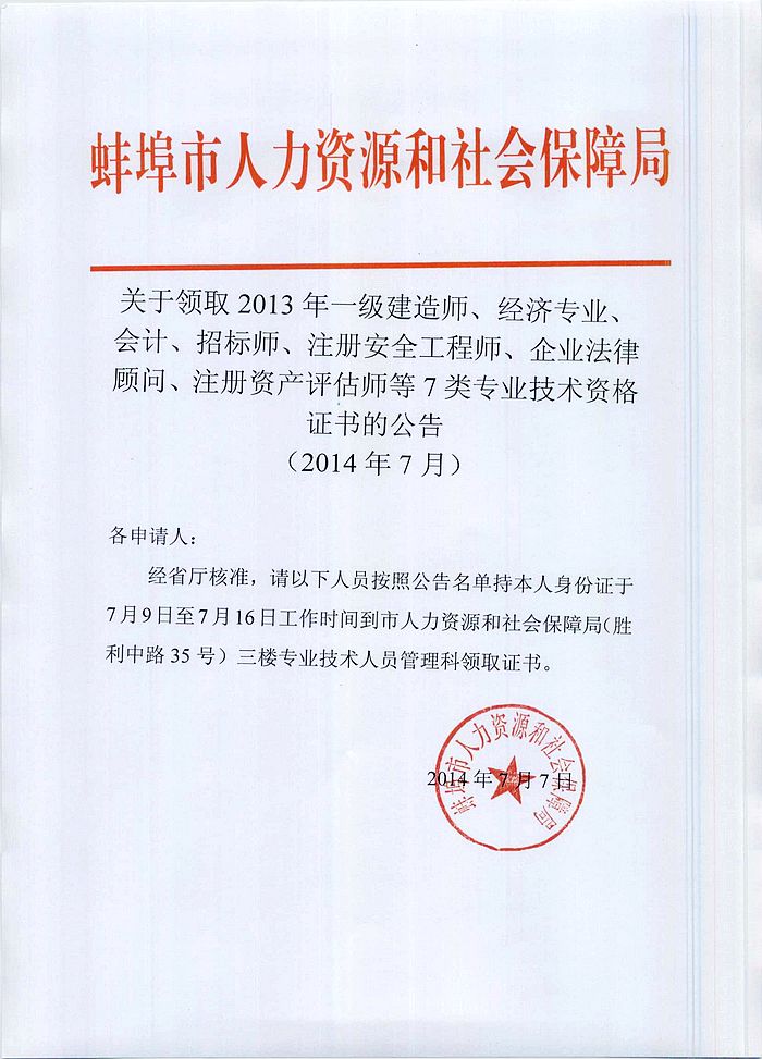 蚌埠2013年一級建造師證書領(lǐng)取通知