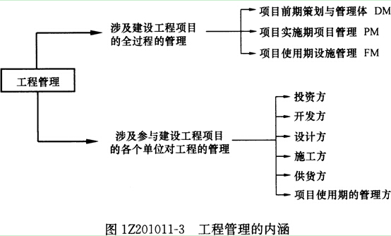 “建設(shè)工程管理”涉及參與工程項(xiàng)目的各個(gè)方面對(duì)工程的管理,即包括投資方、開(kāi)發(fā)方、設(shè)計(jì)方、施工方、供貨方和項(xiàng)目使用期的管理方的管理,如圖1Z201011-3所示。