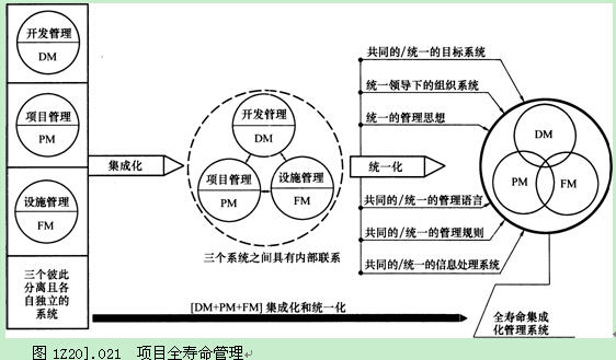 (2)將項(xiàng)目決策階段的開發(fā)管理(DM―Devel。pment Management)、實(shí)施階段的項(xiàng)目管理(PM――Project Management)和使用階段的設(shè)施管理(FM~Facility Man―agement)集成為項(xiàng)目全壽命管理(Lifecycle Management),其含義如圖1Z201021所示。