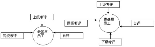 青島啤酒廠兼并漢斯啤酒廠后,為漢斯啤酒廠引進(jìn)了360°考評體系,注重績效,全在而客觀地考評員工的德、能、勤、績。所謂360°考評體系,即對基層員工的考核由自評、同級考評、上級考評三個維度構(gòu)成,對中層干部,還要請其下級評定(通常采用無記名填表和座談相結(jié)合),如圖5-3所示。