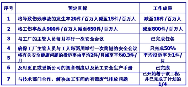 張先生1年半以前出任安全主管,當時,公司的事故發生率和嚴重程度都比同行業平均水平高60%,主管部門和安全檢查人員曾多次指出公司有違反安全標準的行為。1年前,當你與張先生就安全工作目標的問題第一次進行會談時,他在改善公司的安全生產和員工保健工作方面已經取得了相當大的進展,但還存在一些問題亟待完善。以下表中所示為1年前你們雙方共同確立的工作目標,以及截止上個月為止其實際工作成果的統計資料。