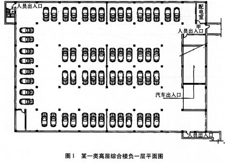 21、某一類高層綜合樓,地下一層為汽車庫和設備用房,車庫部分建筑面積約為5900m2,可停放車輛約170輛,車庫高度為4.8m,圖1為其平面圖(見下頁圖),請分析