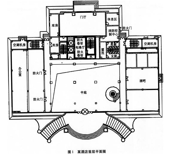 21、圖1為某酒店的首層平面圖(見下頁(yè)圖),該酒店建筑高度為84.7m,其中中庭部分貫通至四層,高度為14.8m,二三四層中庭周圍為回廊,回廊與中庭結(jié)合處設(shè)置了防火卷簾,請(qǐng)分析以下問題: