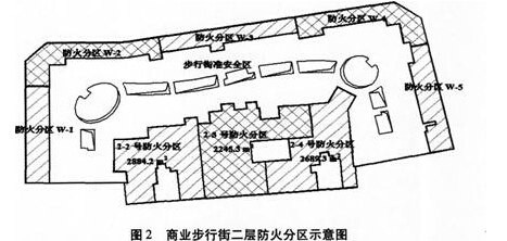 步行街二層和三層的樓板在不同部分開口,形成了多個(gè)中庭,通過(guò)貫通的中庭三層疊加計(jì)算步行街的建筑面積達(dá)到49916.61m2。步行街二層防火分區(qū)示意圖如圖2所示。請(qǐng)分析以下問題: