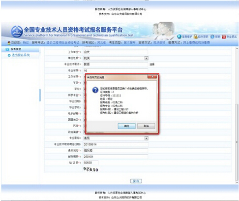 如果是首次報考或雖已報名但2011年以后未報考過的考生將視為新考生,如果2011年以后報考過將作為老考生報考。首先選擇報考人員所在地市和審核點,接著選擇報考級別和報考專業,選擇報考的考試科目,選擇本人符合的報考條件,接著填寫其它報考信息(見下圖)。填寫完成之后,輸入驗證碼并點擊【保存】,會出現保存信息確認框,包括證件類型、證件號碼、姓名、報考級別、報考專業以及考試科目的信息,經核對無誤后,點擊【確定】按鈕(見下圖)。