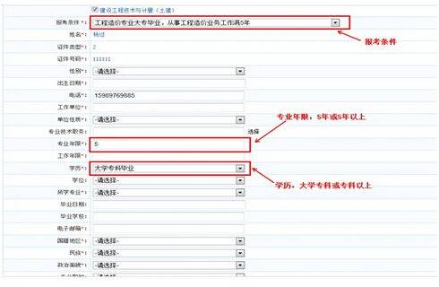 造價考試包括9種報考條件,不同的報考條件報考人員填寫的字段內容各不相同。