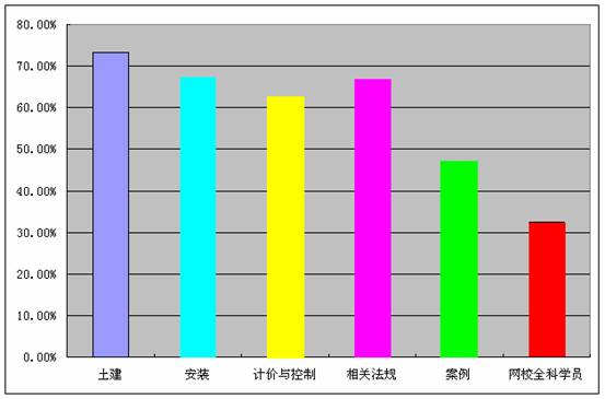 通過(guò)回訪,我們獲知網(wǎng)校2004年造價(jià)工程師考試各門(mén)課程的通過(guò)率如下:土建73.32%;安裝67.14%;計(jì)價(jià)與控制62.53%;相關(guān)法規(guī)66.67%;案例47.15%。此外,報(bào)名參加網(wǎng)校全科學(xué)員的通過(guò)率32.47%。