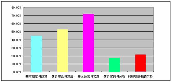 從考試的通過(guò)率來(lái)看,房地產(chǎn)估價(jià)師、造價(jià)工程師的考試難度在不斷加深,網(wǎng)校2004年造價(jià)工程師考試部分科目通過(guò)率較2003年更低,正深刻反映了這種趨勢(shì)。在這里面特別值得關(guān)注的是該兩門(mén)考試的案例分析較其他科目的難度在今年更為加大,從網(wǎng)校造價(jià)工程師案例分析的通過(guò)率在47.15%,房地產(chǎn)估價(jià)師案例分析的通過(guò)率在17.23%就可以看出。