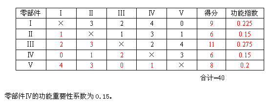 23、某產(chǎn)品各個(gè)零部件功能重要程度采用0-4法評分,其結(jié)果如下: