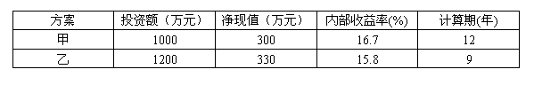 16、 現有兩個常規投資方案,當i= 10%時,兩個方案的凈現值相等,ic為12.8%,其他條件如下表。則( )。