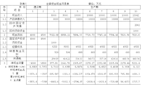 根據全部投資現金流量表計算該項目的財務凈現值為1737.7萬元,如附表5所示。