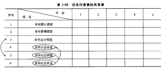 。3)等額本息償還在項(xiàng)目還本付息表中,每年償還的本金及利息的合計(jì)是一個固定值。經(jīng)營期每年應(yīng)還本息一經(jīng)營期第一年年初累計(jì)借款×(A/P,i,n);式中i為建設(shè)期貸款年利率,咒為等額本息償還年份。在建設(shè)期各年,借款本息只計(jì)不還。