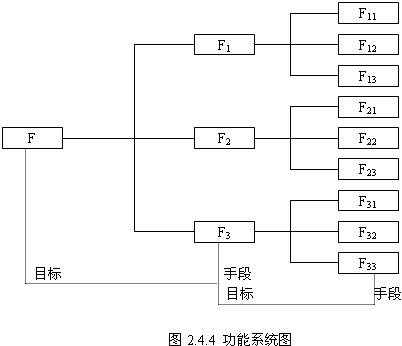 在圖2.4.4中,從整體功能F開始,由左向右逐級展開,在位于不同級的相鄰兩個功能之間,左邊的功能(上級)是右邊功能(下級)的目標,而右邊的功能(下級)是左邊功能(上級)的手段。