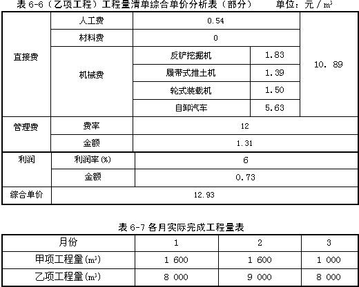 (1)分項(xiàng)工程清單中含有兩個(gè)分項(xiàng)工程,工程量分別為甲項(xiàng)4 500 m3,乙項(xiàng)31 000 m3,清單報(bào)價(jià)中,甲項(xiàng)綜合單價(jià)為200元/m3,乙項(xiàng)綜合單價(jià)為12.93元/m3,乙項(xiàng)綜合單價(jià)的單價(jià)分析表見表6-6。當(dāng)某一分項(xiàng)工程實(shí)際工程量比清單工程量增加超出10%時(shí),應(yīng)調(diào)整單價(jià),超出部分的單價(jià)調(diào)整系數(shù)為0.9;當(dāng)某一分項(xiàng)工程實(shí)際工程量比清單工程量減少10%以上時(shí),對(duì)該分項(xiàng)工程的全部工程量調(diào)整單價(jià),單價(jià)調(diào)整系數(shù)為1.1。