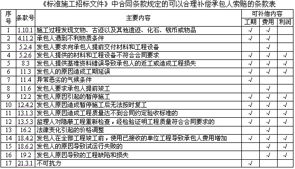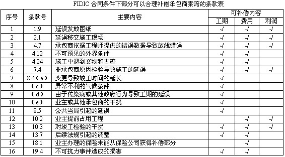 下表 中列示了FIDIC合同條件下部分可以合理補償承包商的條款。
