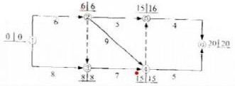 【解題思路】采用標號法確定關鍵線路:①→②→④→⑥和①→③→④→⑥,所以選項AB是正確選項;工作2-5的EF=11,工作5-6的ES=15,工作2-5的自由時差為4;工作3-4是關鍵線路上的工作,所以是關鍵工作;工作5-6的ES=15,計劃工期為20,工作5-6的LF=20,工作5-6的LS=16,所以工作5-6的總時差為1。