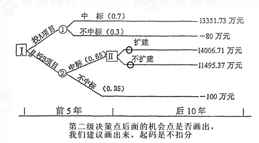 (3)判斷B項(xiàng)目在5年后是否擴(kuò)建?計(jì)算各機(jī)會(huì)點(diǎn)期望值,并做出投標(biāo)決策。