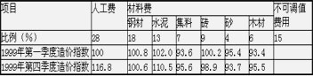 某綜合樓工程項目合同價為1750萬元,該工程簽訂的合同為可調(diào)值合同。合同報價日期為1999年3月,合同工期為12個月,每季度結(jié)算一次。工程開工日期為1999年4月1日。施工單位1999年第四季度完成產(chǎn)值是710萬元。工程人工費、材料費構(gòu)成比例以及相關季度造價指數(shù)如表5-22所示。