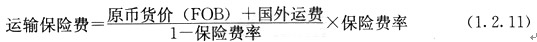 (3)運輸保險費。對外貿易貨物運輸保險是由保險人(保險公司)與被保險人(出口人或進口人)訂立保險契約,在被保險人交付議定的保險費后,保險人根據保險契約的規定對貨物在運輸過程中發生的承保責任范圍內的損失給予經濟上的補償。這是一種財產保險。計算公式為: