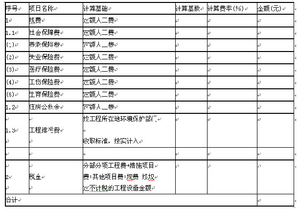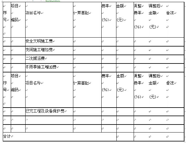 注:1.“計算基礎”中安全文明施工費可為“定額基價”、“定額人工費”或“定額人工費+定額機械費”,其他項目可為“定額人工費”或“定額人工費+定額機械費”。