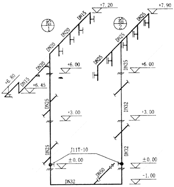 2、給水管道均為鍍鋅鋼管,螺紋連接。給水管道與墻體的中心距離為200mm.