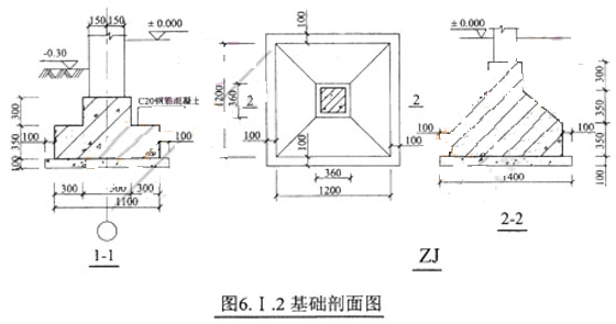 某工程基礎平面圖如圖6.Ⅰ.1所示,現澆鋼筋混凝土帶形基礎、獨立基礎的尺寸如圖6.Ⅰ.2所示。混凝土墊層強度等級為C15,混凝土基礎強度等級為C20,按外購商品混凝土考慮。混凝土墊層支模板澆筑,工作面寬度300mm,槽坑底面用電動夯實機夯實,費用計入混凝土墊層和基礎中。