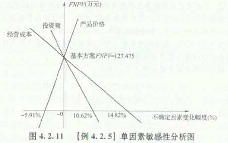 (3)對項(xiàng)目進(jìn)行敏感性分析。取定三個(gè)因素:投資額、產(chǎn)品價(jià)格和經(jīng)營成本,然后令其逐一在初始值的基礎(chǔ)上按±10%、±20%的變化幅度變動。分別計(jì)算相對應(yīng)的凈現(xiàn)值的變化情況,得出結(jié)果見表4.2.5及圖4.2.11所示。