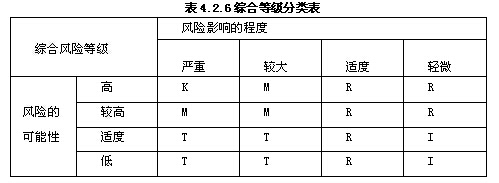 立綜合風(fēng)險(xiǎn)等級的矩陣,將綜合風(fēng)險(xiǎn)分為K級、M級、T級、R級、I級,見表4.2.6。